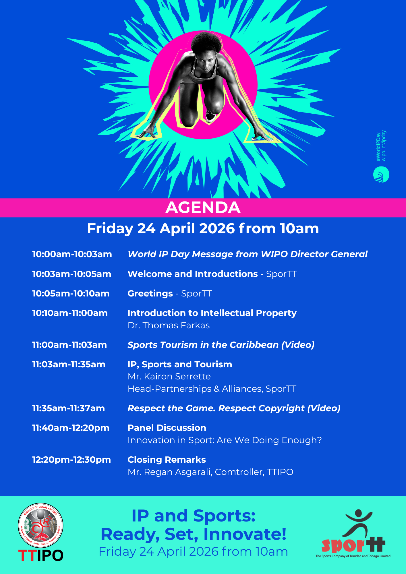 The Sports Company of Trinidad and Tobago (SporTT) in collaboration with the Trinidad and Tobago Intellectual Property Office (TTIPO) is pleased to invite all National Governing Bodies (NGBs) to participate in a virtual seminar being hosted in observance of World Intellectual Property Day 2026, under the theme: IP and Sports: Ready, Set, Innovate!