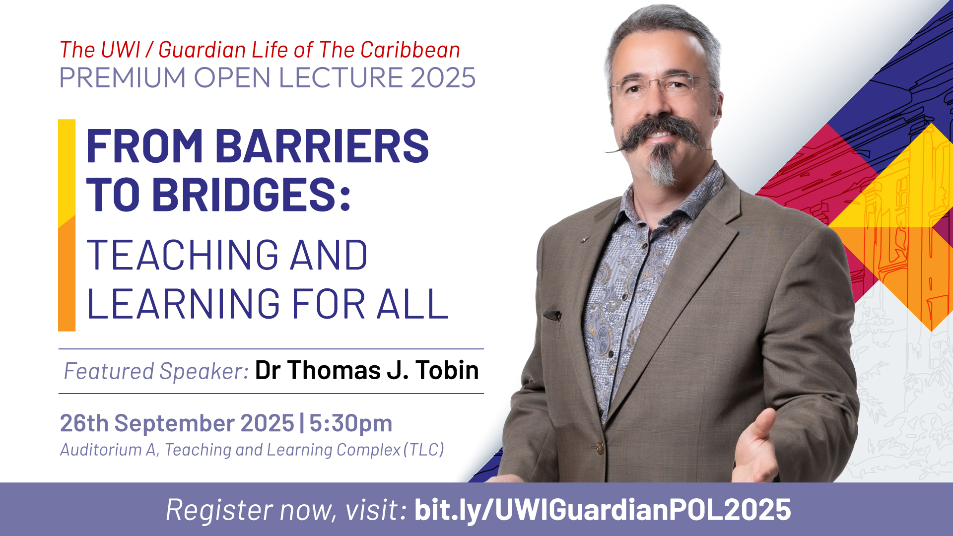 The Centre for Excellence in Teaching and Learning at The University of the West Indies (UWI), St. Augustine Campus, invites educators and stakeholders to the UWI/Guardian Life Premium Open Lecture 2025 on Friday, 26th September 2025 at 5:30 PM. This event will be held in Auditorium A of the Teaching and Learning Complex (TLC) and marks the 25-year partnership between UWI and Guardian Life of The Caribbean Limited, celebrating their shared commitment to advancing education and fostering excellence in teaching and learning across the Caribbean.