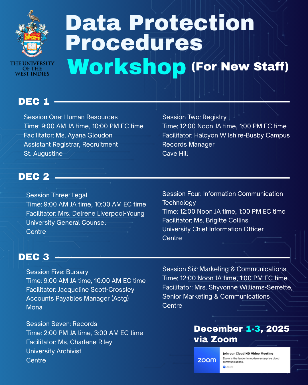 New staff members are invited to participate in the Data Protection Procedures Workshop, a three-day virtual training series designed to strengthen understanding of the University’s data protection policies, responsibilities, and best practices.