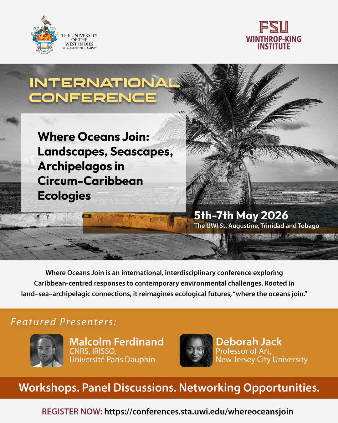 Professor Elizabeth Walcott-Hackshaw, Dean of the Faculty of Humanities and Education at The University of the West Indies, St. Augustine, in collaboration with Professor Martin Munro, Director of the Winthrop-King Institute at Florida State University, is pleased to announce the upcoming international conference, Where Oceans Join from May 5 to May 7, 2026 at the UWI, St. Augustine.