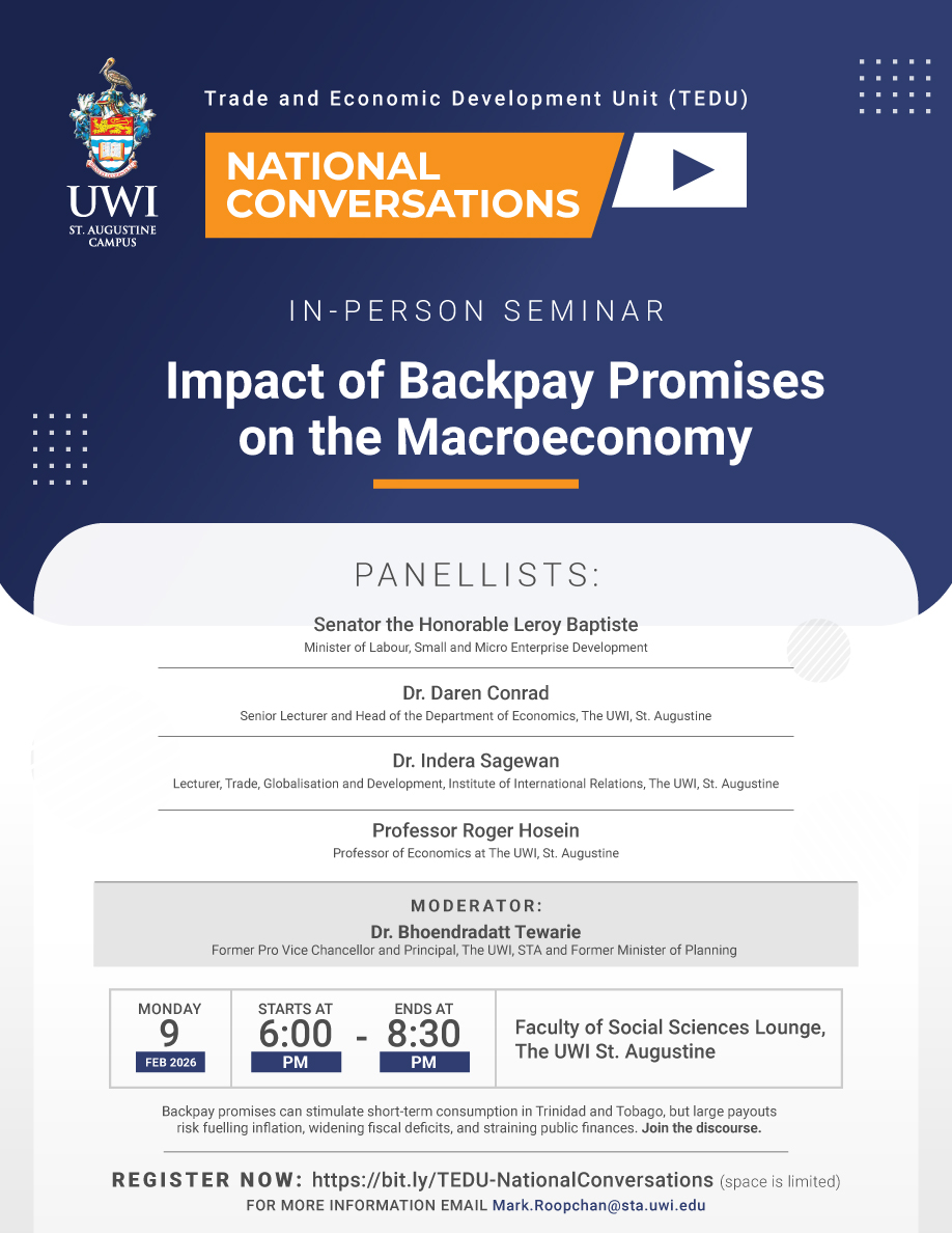 The Trade and Economic Development Unit of the Faculty of Social Sciences invites members of the Campus and wider national community to participate in National Conversations: Impact of Backpay Promises on the Macroeconomy, a timely discussion on February 9, 2026, focused on critical macroeconomic issues affecting Trinidad and Tobago. This forum forms part of The University of the West Indies’ ongoing outreach initiative to foster informed public dialogue on national economic policy.