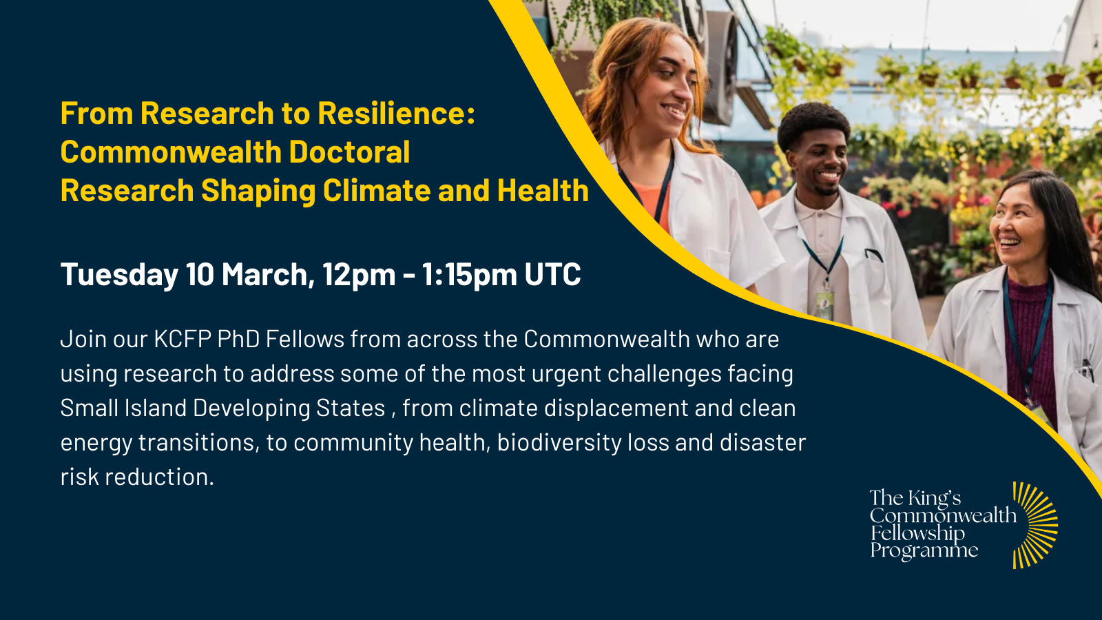 Join The King’s Commonwealth Fellowship Programme on Tuesday, March 10, 2026 at 12:00 p.m. to 1:15 p.m. UTC for an interactive webinar spotlighting PhD research from the King’s Commonwealth Fellowship Programme (KCFP), focused on solutions for Small Island Developing States and other at-risk communities.