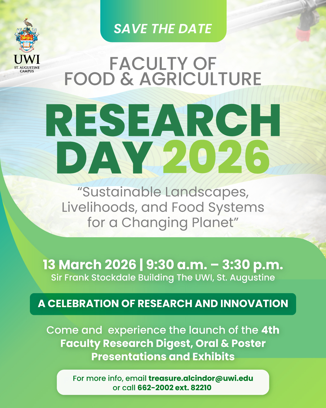 The Campus Community is invited to attend the Faculty of Food and Agriculture Research Day on Friday, March 13, 2026, from 9:30 a.m. to 3:30 p.m. at the Sir Frank Stockdale Building, The University of the West Indies, St. Augustine.