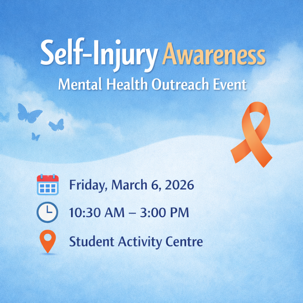 The Health Services Unit (HSU) invites the campus community to a Self-Injury Awareness Mental Health Outreach Event aimed at breaking stigma, promoting understanding and connecting students with supportive resources. Join us for an interactive and informative experience designed to foster hope, healing and open conversation around mental health.