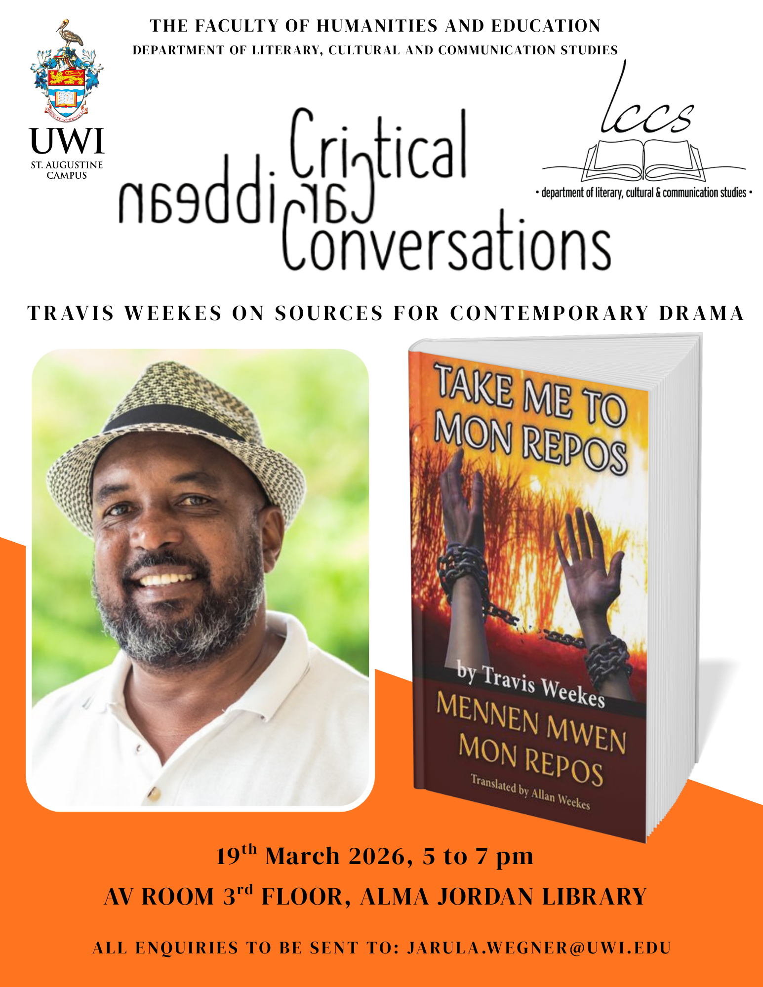 The Department of Literary, Cultural and Communication Studies (DLCCS), UWI St. Augustine, invites the campus community to Critical Caribbean Conversations, a series that brings together renowned artists, writers and intellectuals to share their work and engage audiences on pressing contemporary questions and challenges.