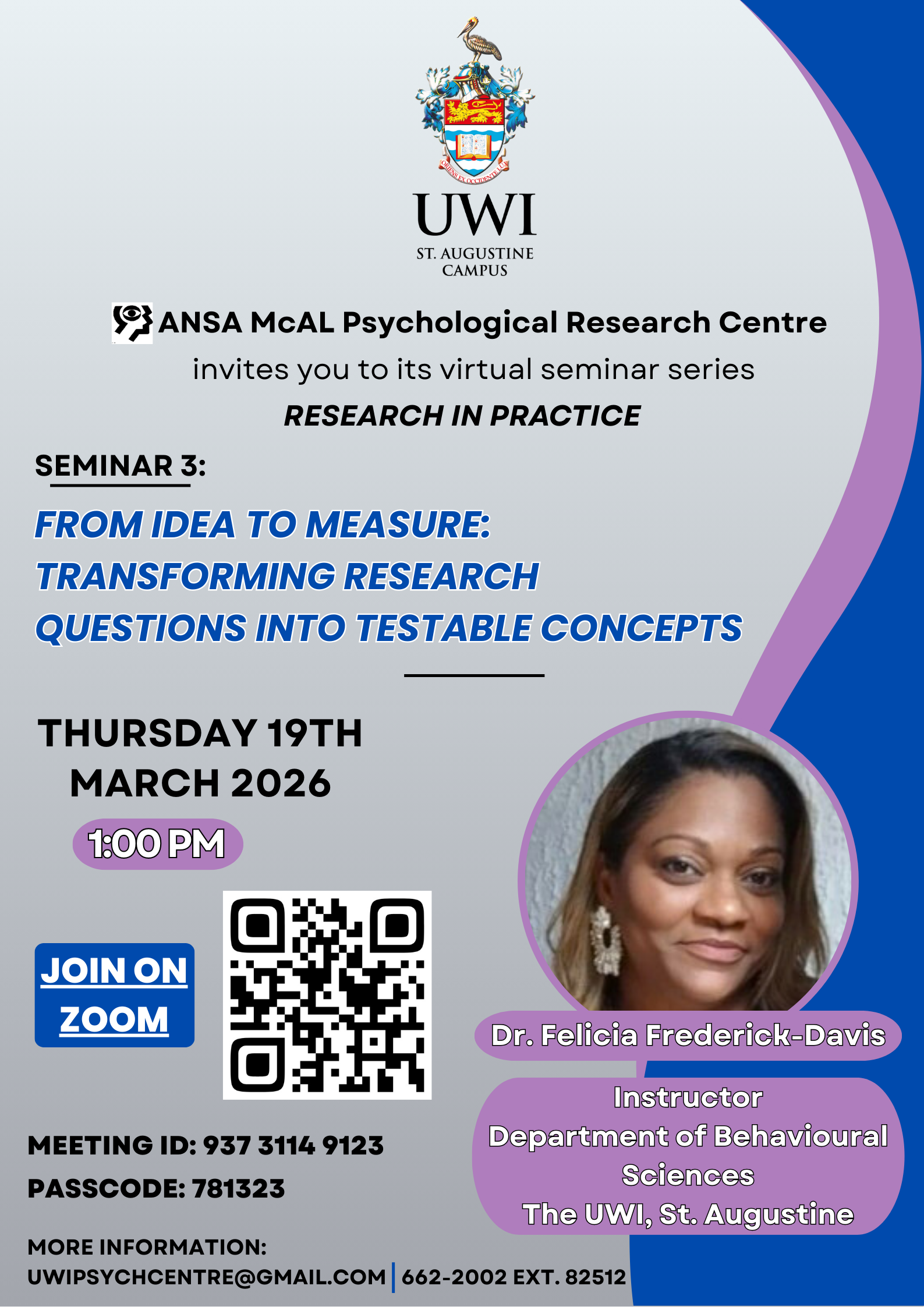 The seminar, entitled, From Idea to Measure: Transforming Research Questions into Testable Concepts, will be presented by Dr. Felicia Frederick-Davis, Instructor, Department of Behavioural Sciences, The UWI, St. Augustine Campus. Dr. Frederick-Davis's primary research interests focus on mental health disorders, non-communicable diseases and health behaviour decision-making.