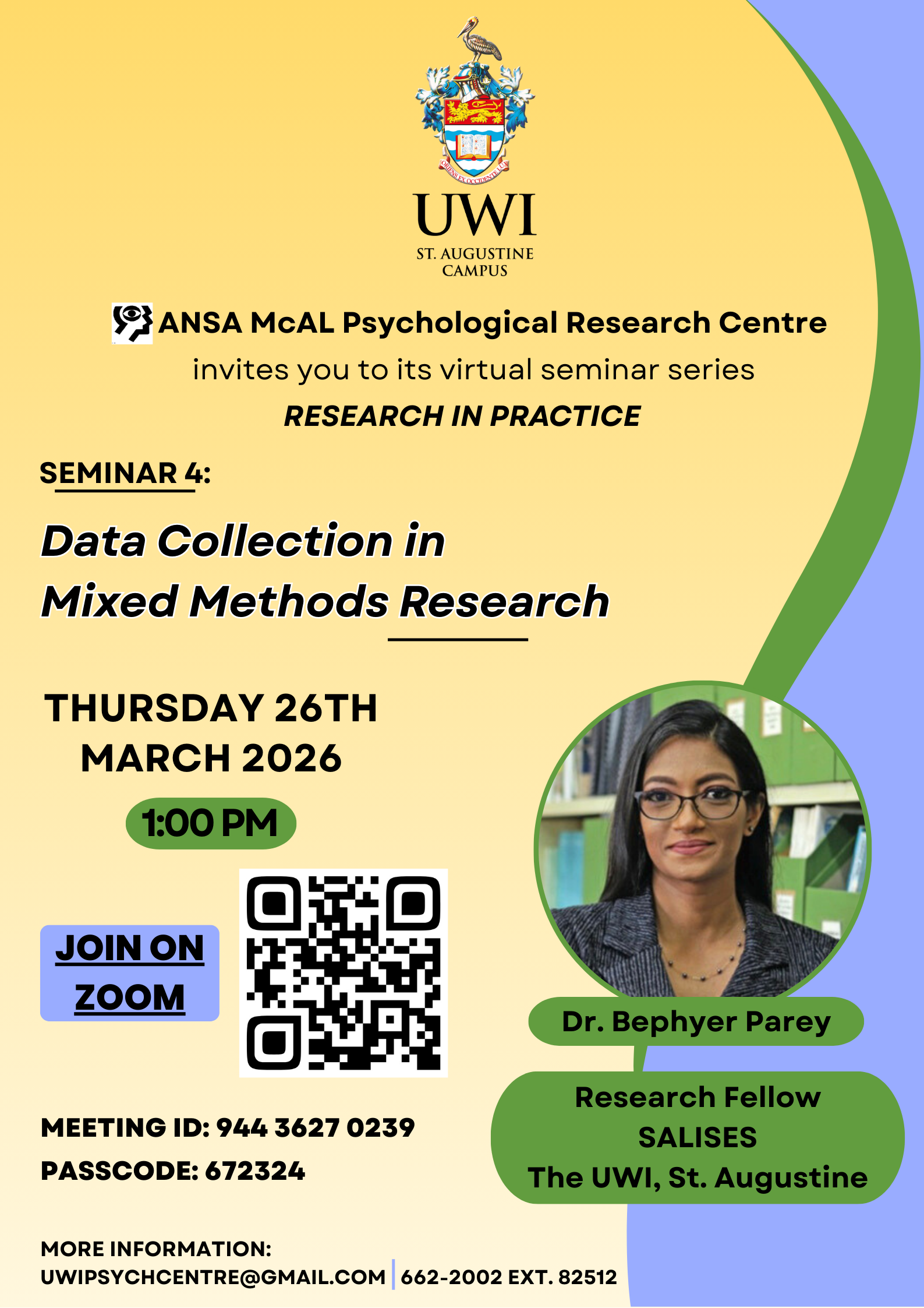 The seminar, entitled, Data Collection in Mixed Methods Research, will be presented by Dr. Bephyer Parey, a Research Fellow, SALISES, The UWI, St. Augustine Campus. Her research interests include Social Policy centred around disabilities. Dr Parey also serves as chair of the SALISES Disability Studies Research Cluster and as Academic Coordinator of the MSc Development Statistics programme.