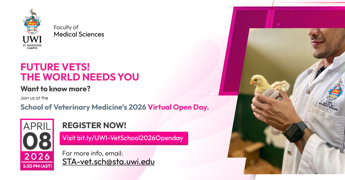 Learn more about the School of Veterinary Medicine (SVM) at The University of the West Indies, St. Augustine, during this upcoming virtual open house on Wednesday, April 8, 2026, at 5:30 p.m. via Zoom.