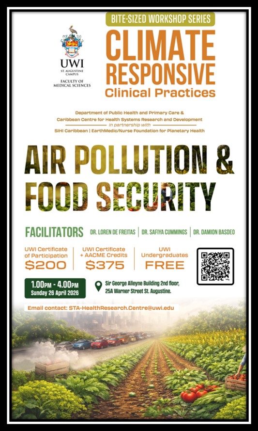 Hosted by the Department of Public Health and Primary Care and the Caribbean Centre for Health Systems Research and Development (CCHSRD), in partnership with SIHI Caribbean and the EarthMedic/Nurse Foundation for Planetary Health, this interactive workshop will examine the relationship between environmental health and clinical practice, with a focus on how air quality affects food systems and public health outcomes.