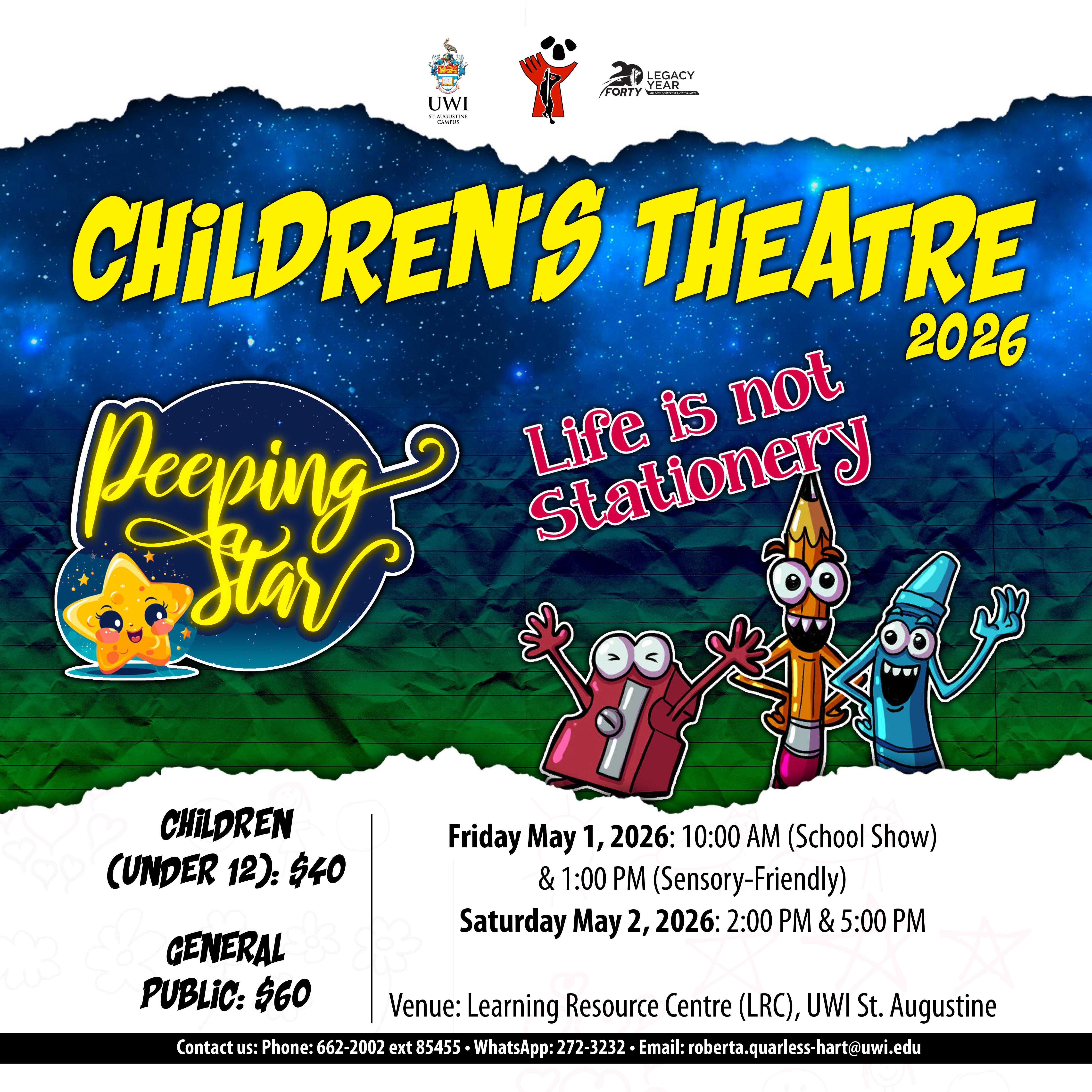 The Department of Creative and Festival Arts (DCFA) at The UWI St. Augustine presents its 2026 Children’s Theatre Production, featuring two enchanting plays: Peeping Starand Life is not Stationery. The production runs from May 1–2, 2026, at the Learning Resource Centre (LRC), UWI St. Augustine.