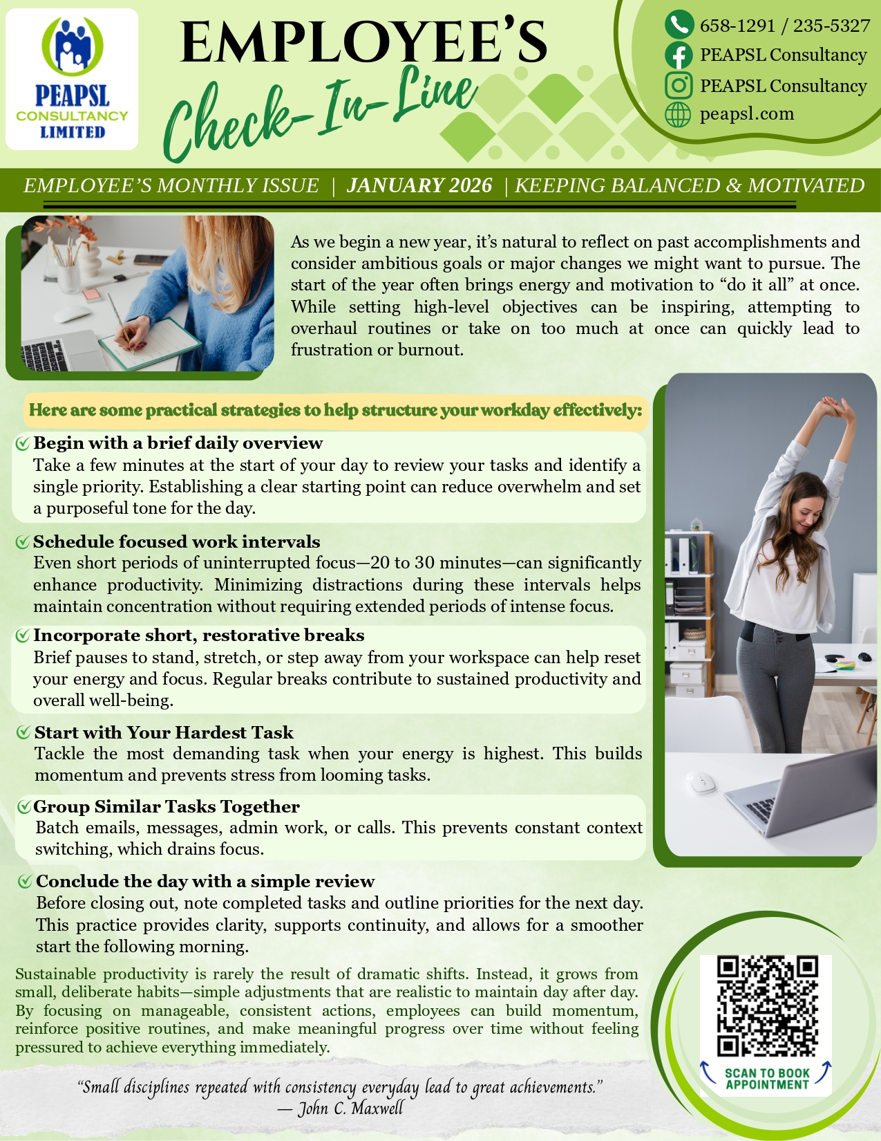 Start the new year with practical strategies to help you stay focused, productive and energized at work. This month’s Employee’s Check-In Line from PEAPSL highlights simple daily habits that support sustainable productivity without burnout.