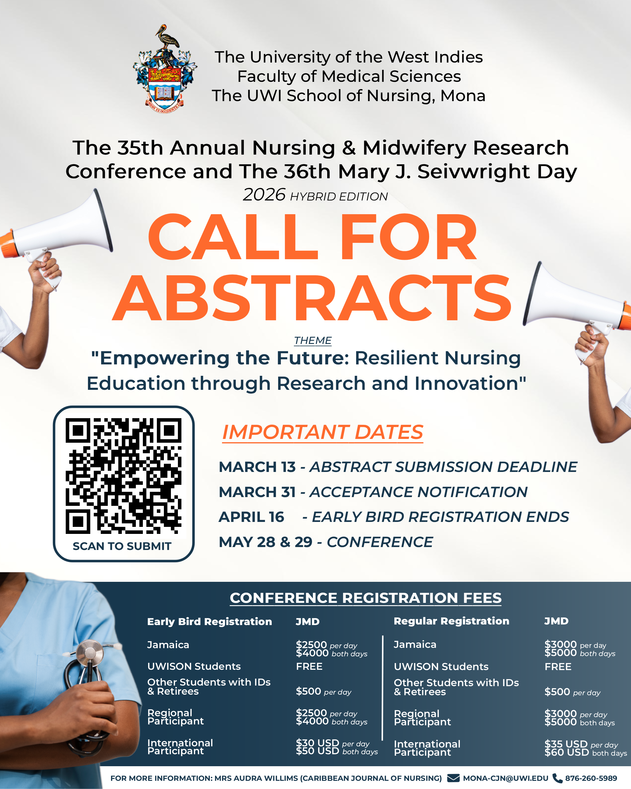 The UWI School of Nursing, Mona, Faculty of Medical Sciences, invites researchers, educators, practitioners and students to submit abstracts for the 35th Annual Nursing & Midwifery Research Conference and 36th May J. Seivwright Day, to be held as a 2026 Hybrid Conference on May 28–29, 2026.