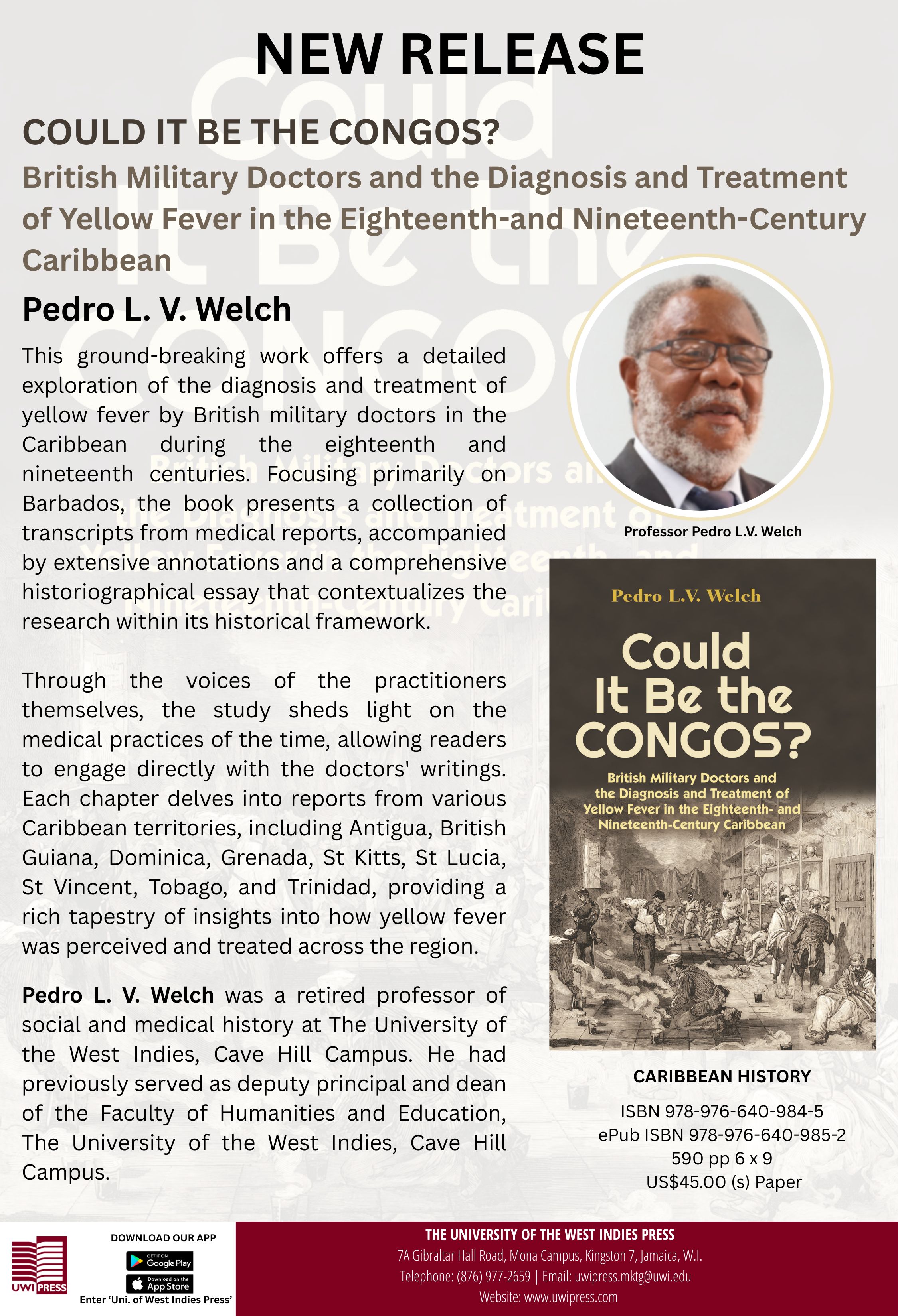 The University of the West Indies Press announces the release of Could It Be The Congos? By Pedro L.V. Welch, a groundbreaking study that examines the diagnosis and treatment of yellow fever by British military doctors in the eighteenth and nineteenth century Caribbean.