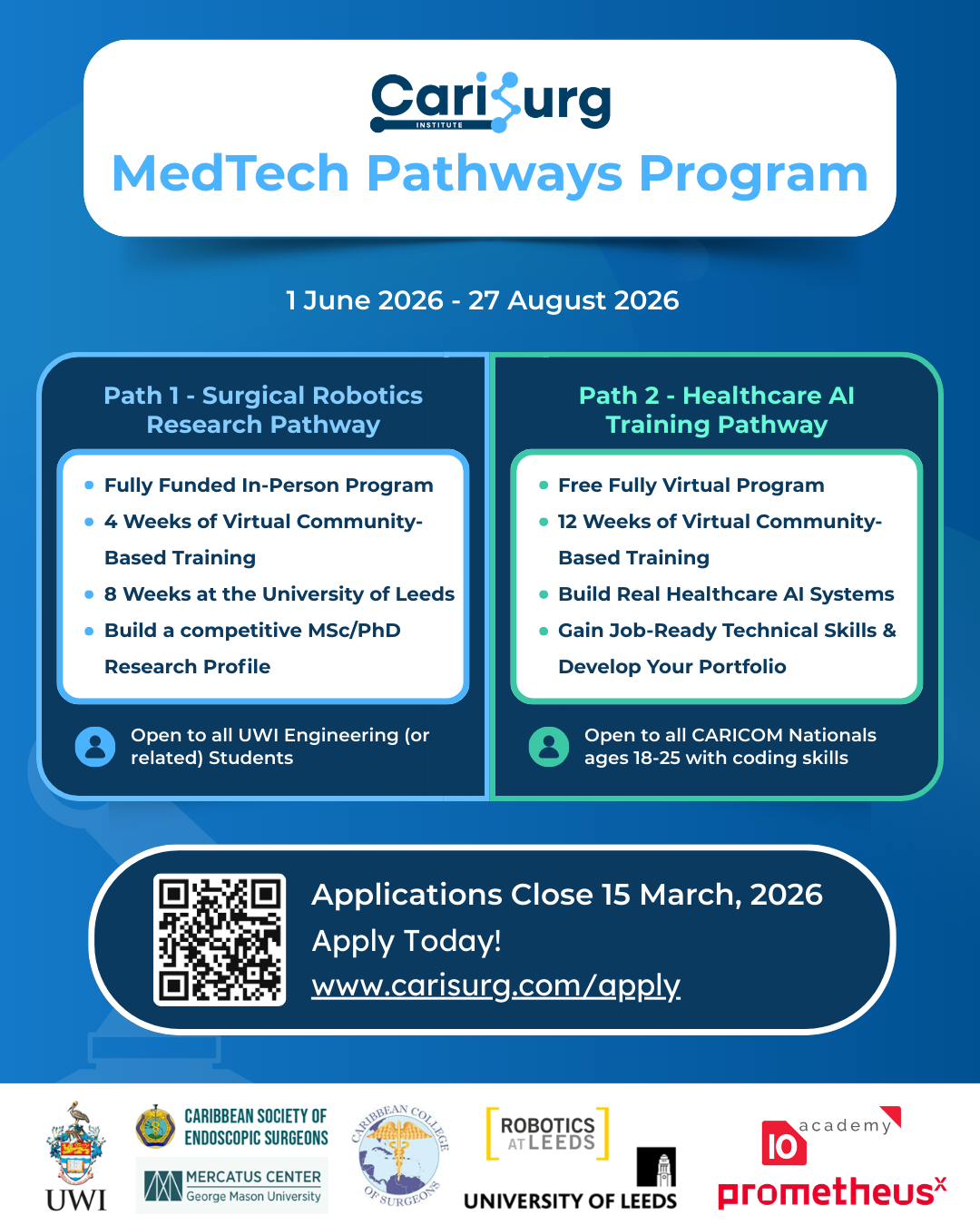 Students are invited to apply for the CariSurg Institute MedTech Pathways Program, a dual-track initiative designed to build Caribbean capacity in cutting-edge medical technology, including surgical robotics, healthcare AI and digital health innovation, that runs from June 1 - August 27, 2026