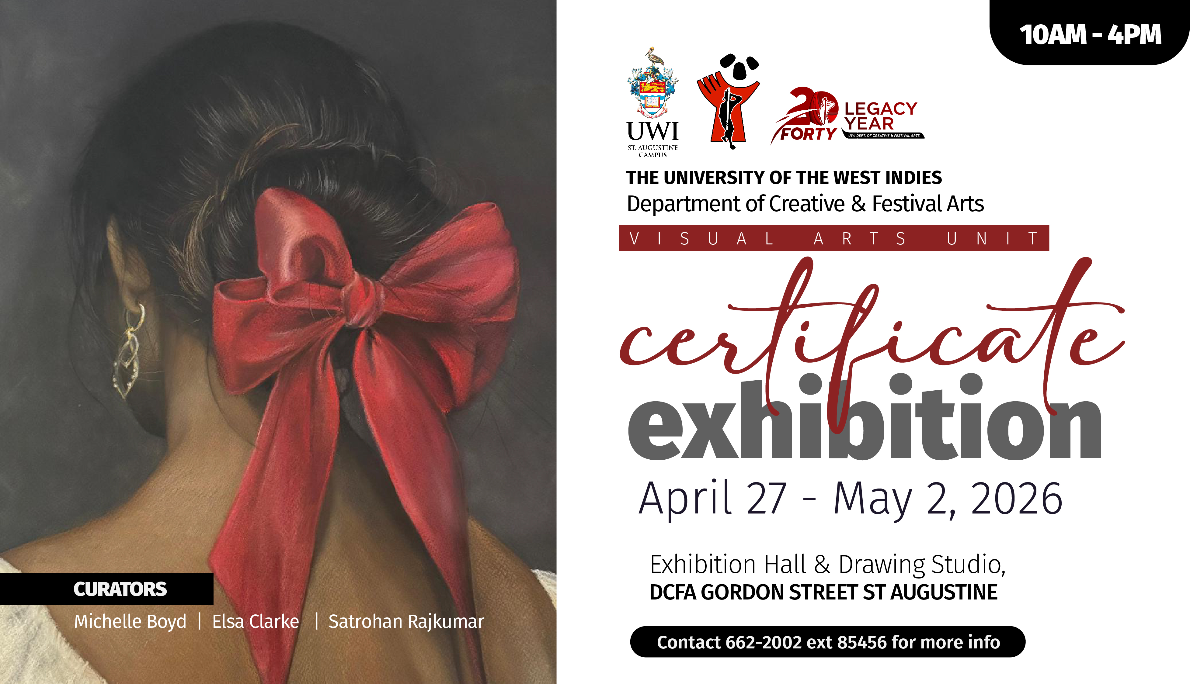 The Department of Creative and Festival Arts (DCFA), The University of the West Indies, invites the campus community and the wider public to the Certificate Visual Arts Exhibition 2026, a culminating showcase for graduating Certificate students and a key feature of the DCFA’s 40 Years Legacy celebrations.