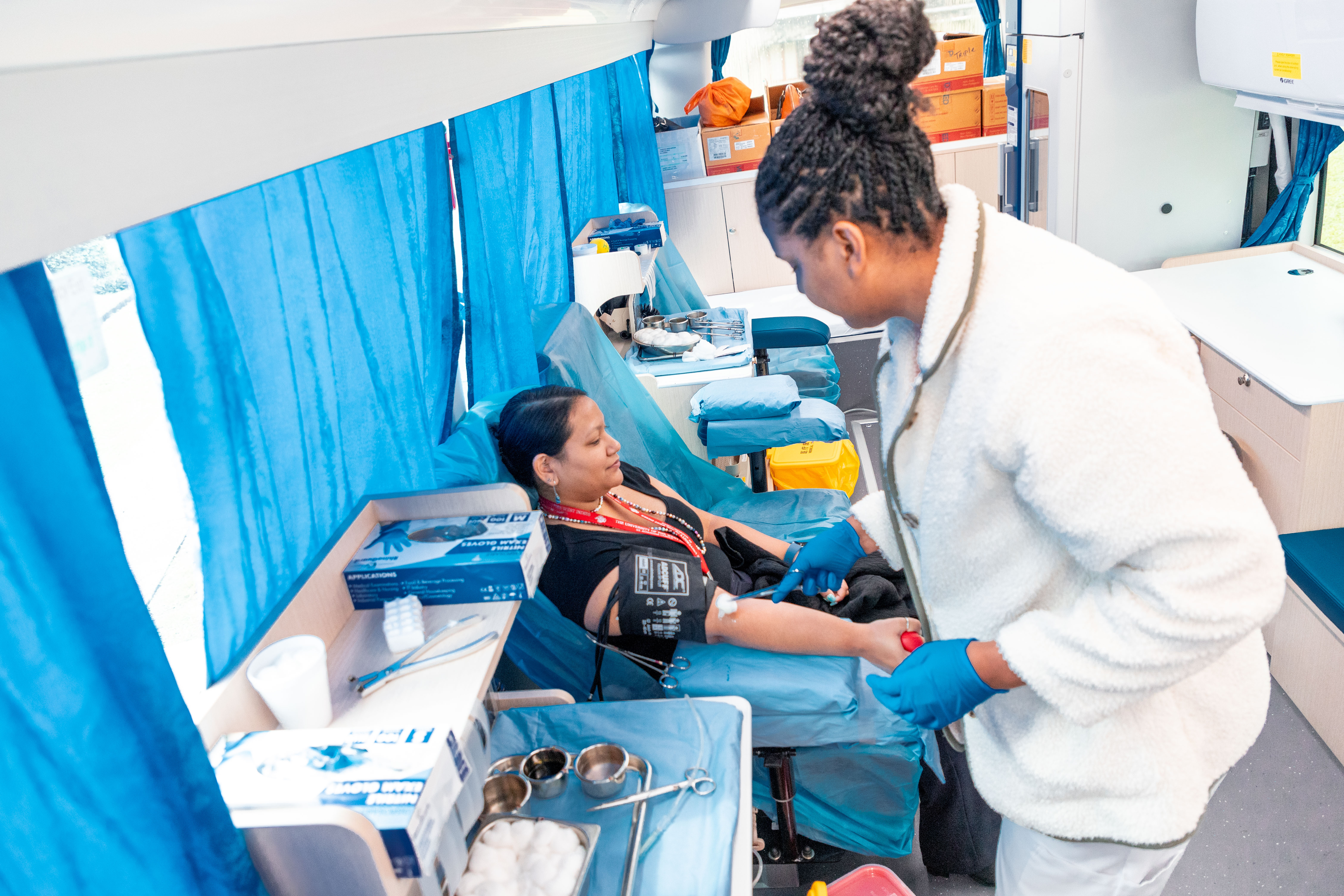 A UWI staff member donates blood inside the UWI Blood Donor Foundation (UWIBDF) Mobile Unit, during the UWIBDF 2024 drive at the Learning Resource Centre (LRC) Greens, The UWI St. Augustine Campus, on Tuesday 11th June, 2024.