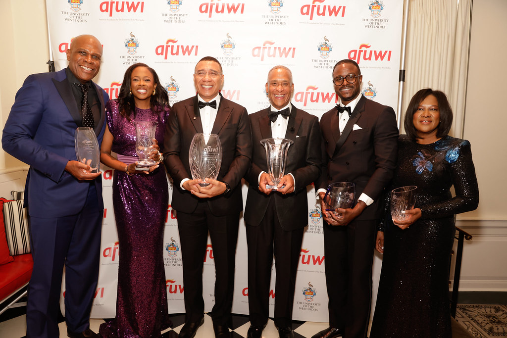 Award recipients at the AFUWI 29th Annual Awards Gala. Honorees pictured include Gregory Belinfanti, Camille Joseph Goldman, Dr. The Most Honourable Andrew M. Holness, Wayne J. Riley, Kevon C. Rhiney, and Dr. Jacky Wright, each recognized for distinguished leadership, service, and impact across business, public service, institutional advancement, technology, and global development.