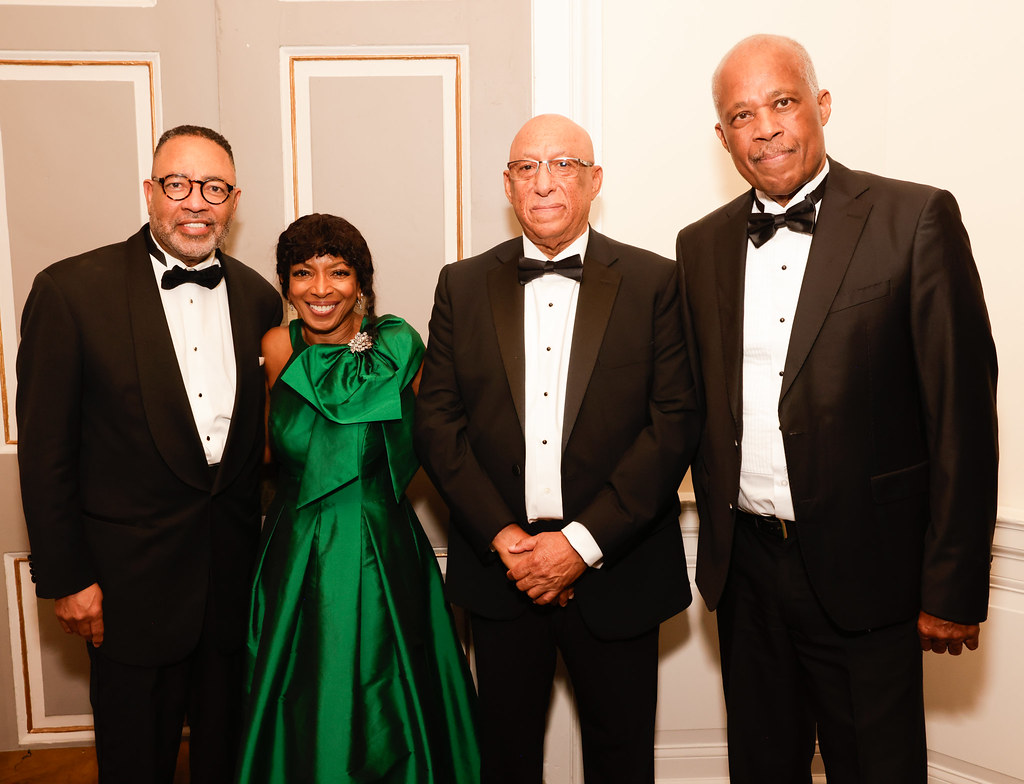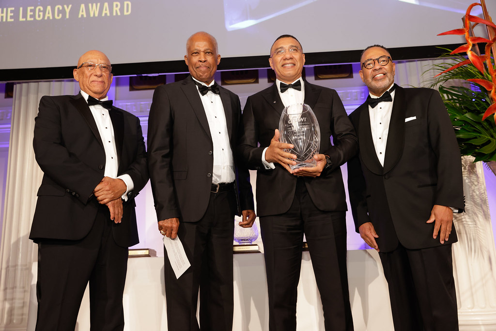 Left to right: The Most Honourable Dodridge D. Miller, Vice‑Chancellor Professor Sir Hilary Beckles, Dr. The Most Honourable Andrew M. Holness, Prime Minister of Jamaica, and Dr. Cyrus McCalla, Chairman of AFUWI, at the AFUWI 29th Annual Awards Gala in New York.