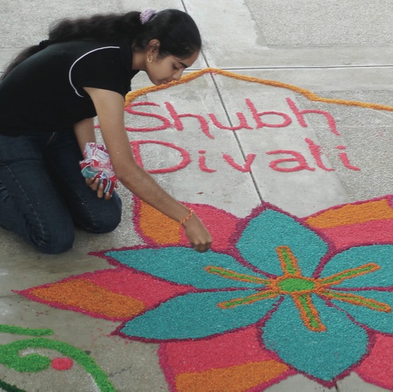 Faith and festivals: A student makes a vibrant rangoli design on the JFK Quadrangle for Divali. Students and staff enhance the beauty and community of campus through the practice of their faiths, one of the many benefits of T&T’s cosmopolitan society.